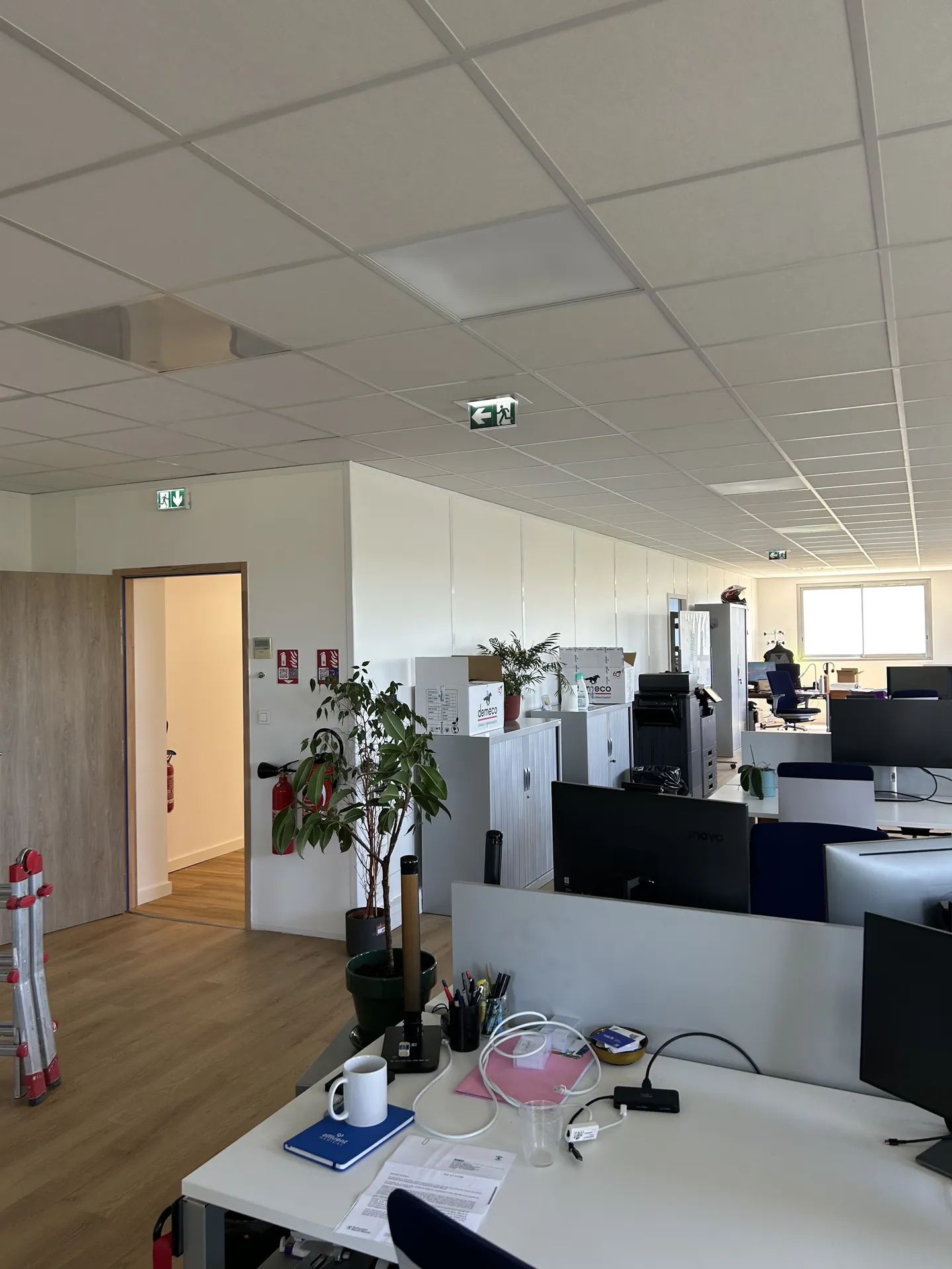 Cette photo illustre une intervention récente de FC Électricité dans des bureaux professionnels situés à Aix-en-Provence. Pour assurer la sécurité incendie et la mise en conformité des locaux, nous avons procédé à l'installation de BAES (Blocs Autonomes d'Éclairage de Sécurité).